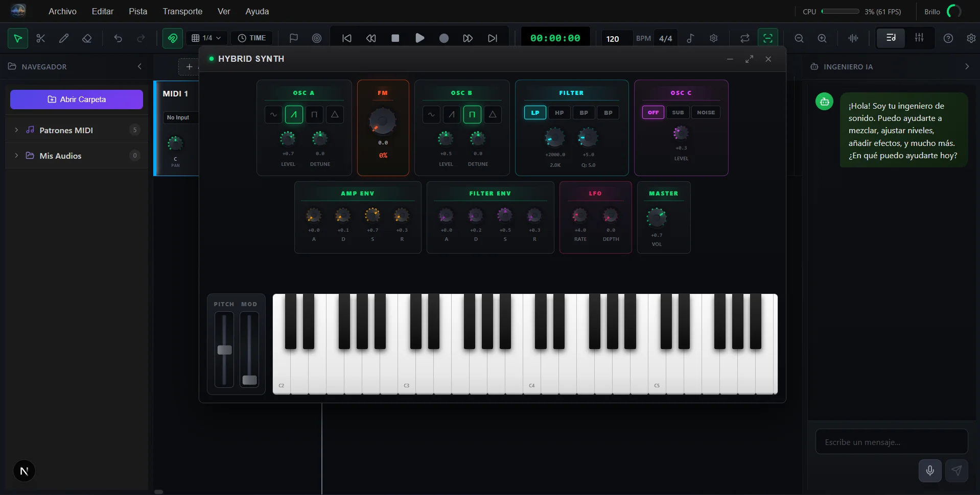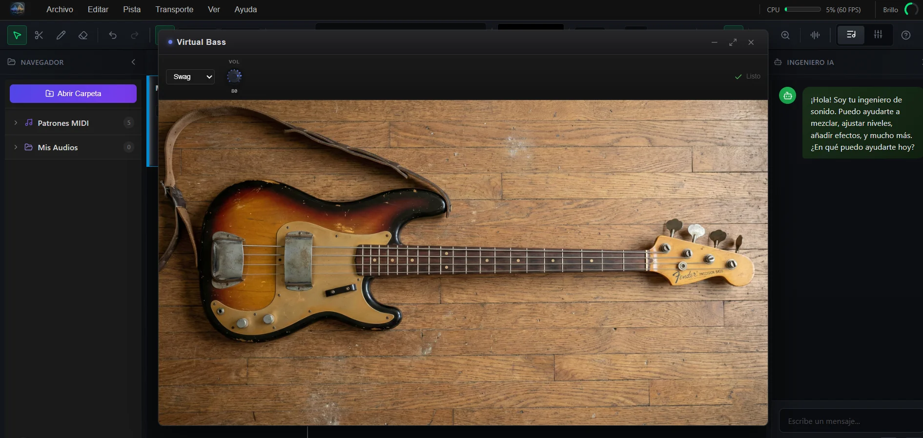 "Crea un bajo deep house" — El AI carga el sinte, configura osciladores y añade efectos.