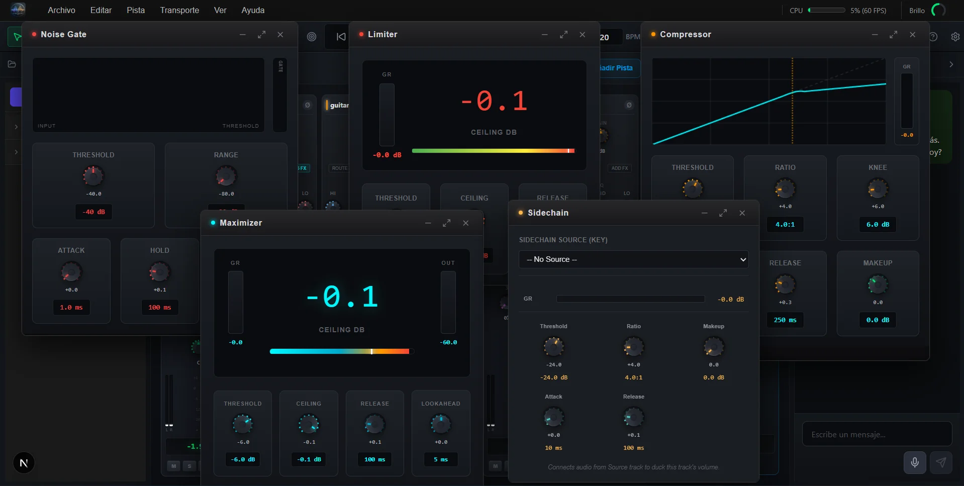 EQ paramétrico, compresores, reverb, delay y más. Cadena de efectos completa por pista.