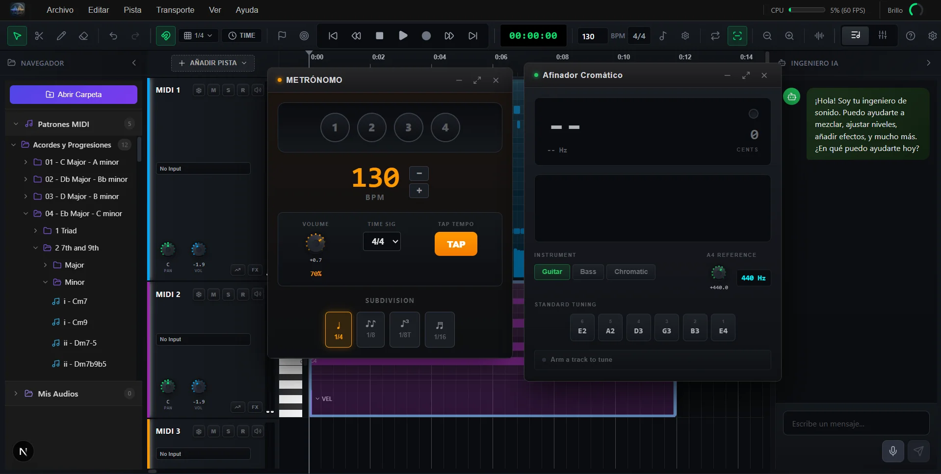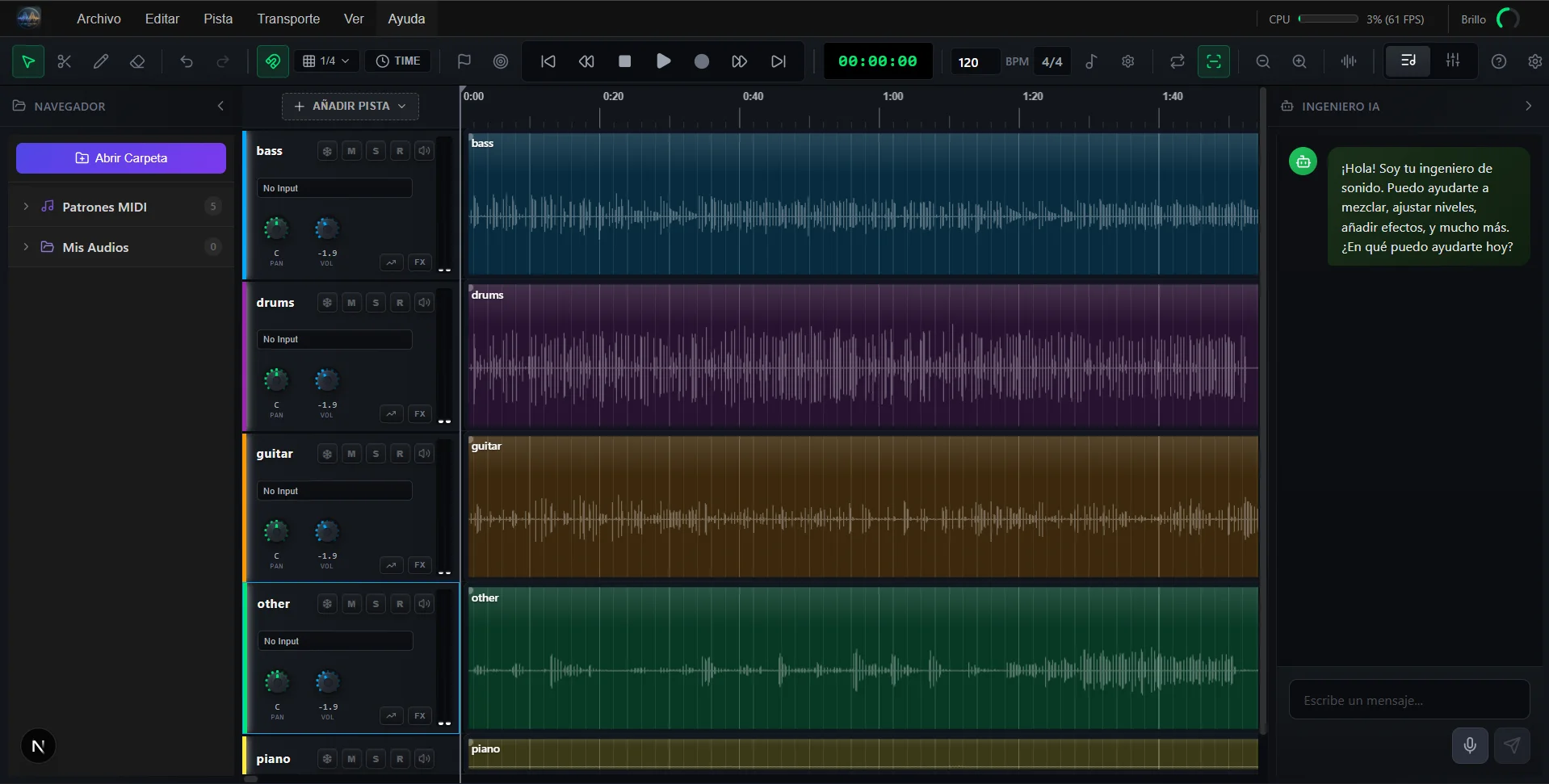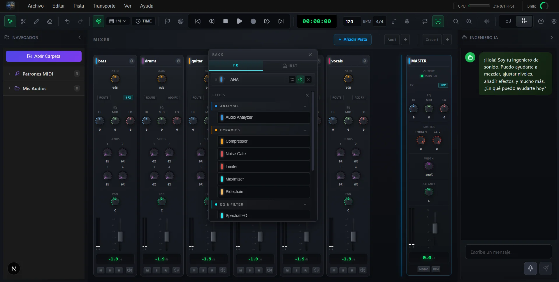 El DAW profesional con Ingeniero de Sonido IA. No es solo una herramienta para grabar, es tu copiloto creativo. Potencia tu creatividad con asistencia inteligente en tiempo real.