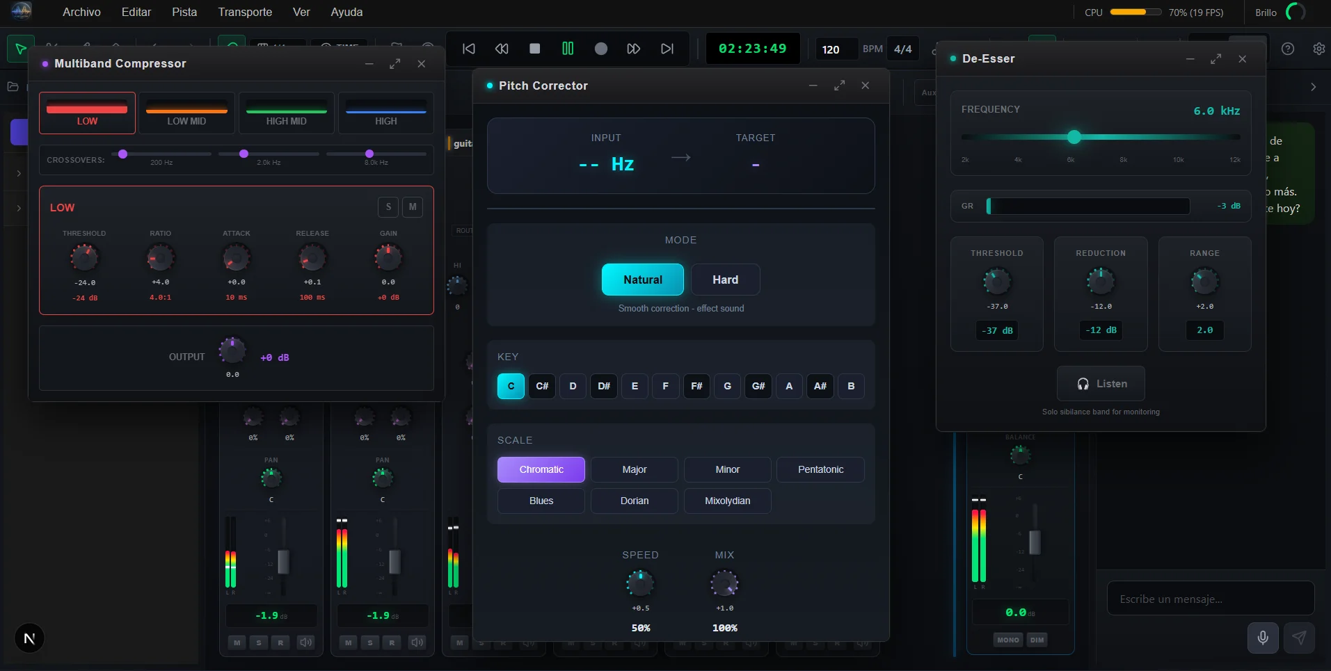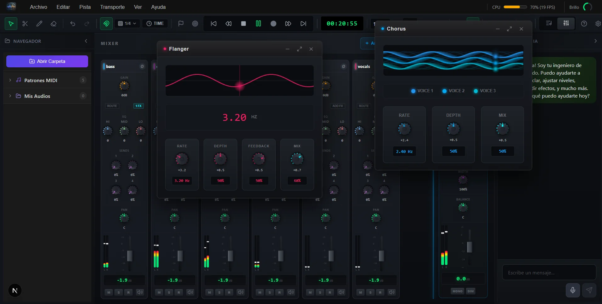 EQ paramétrico, compresores, reverb, delay y más. Cadena de efectos completa por pista.