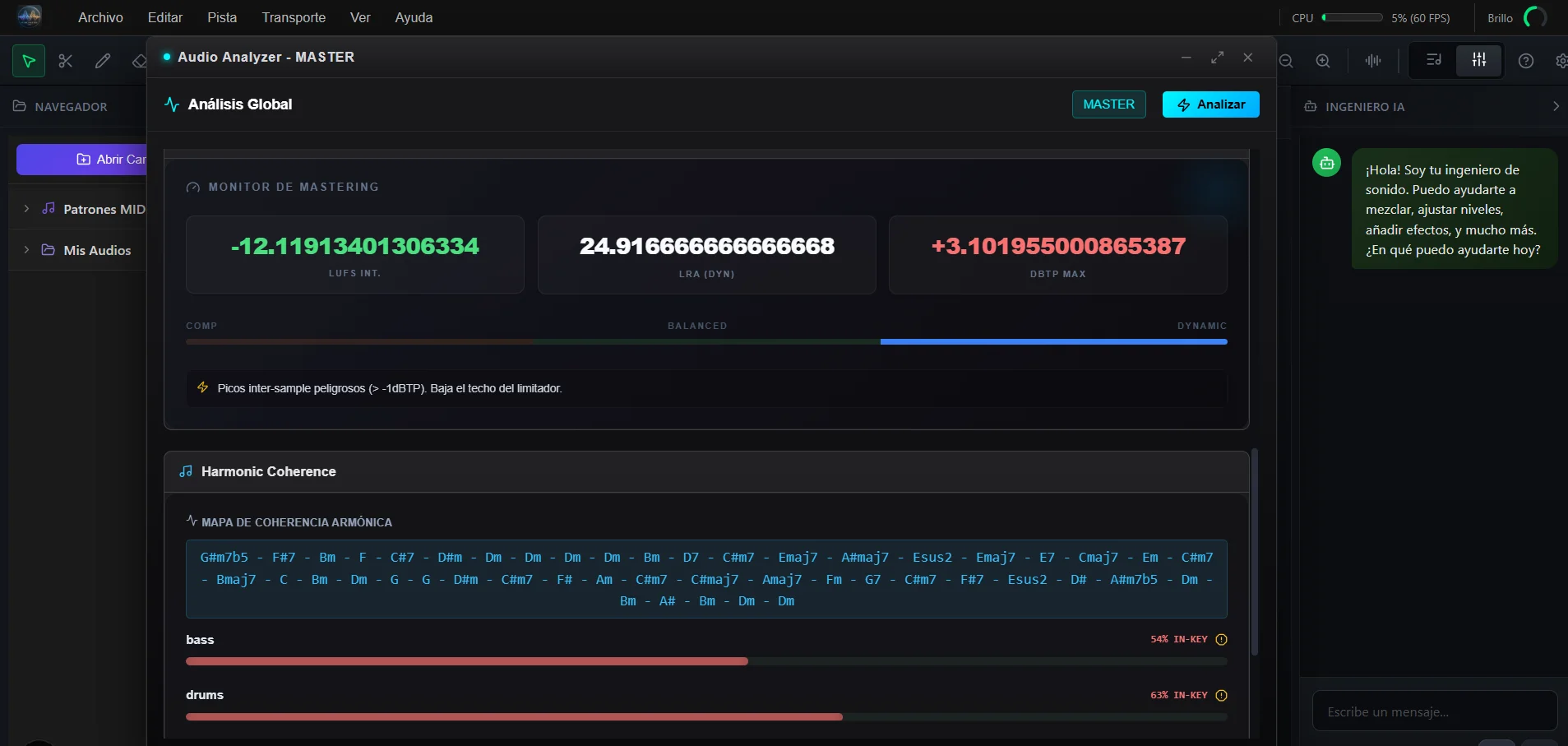 Analiza espectro (FFT), detecta tonalidad, BPM y loudness (EBU R128) con algoritmos profesionales.